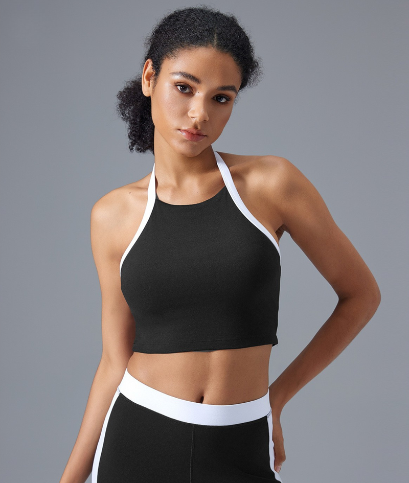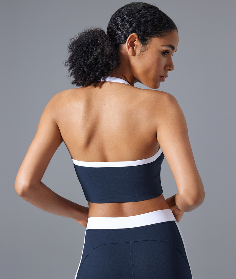 This halter-strap sports bra delivers a sleek, sculpting fit with breathable comfort that moves with you. Crafted from a soft nylon-spandex blend, it offers medium molded support with a modern silhouette — perfect for workouts, running, or layering under everyday looks.
